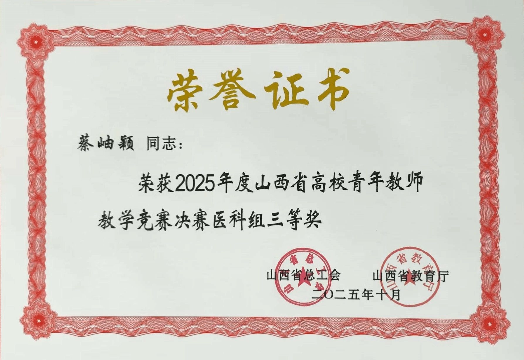 英国365教师蔡岫颖荣获2025年度山西省高校青年教师教学竞赛医科组三等奖