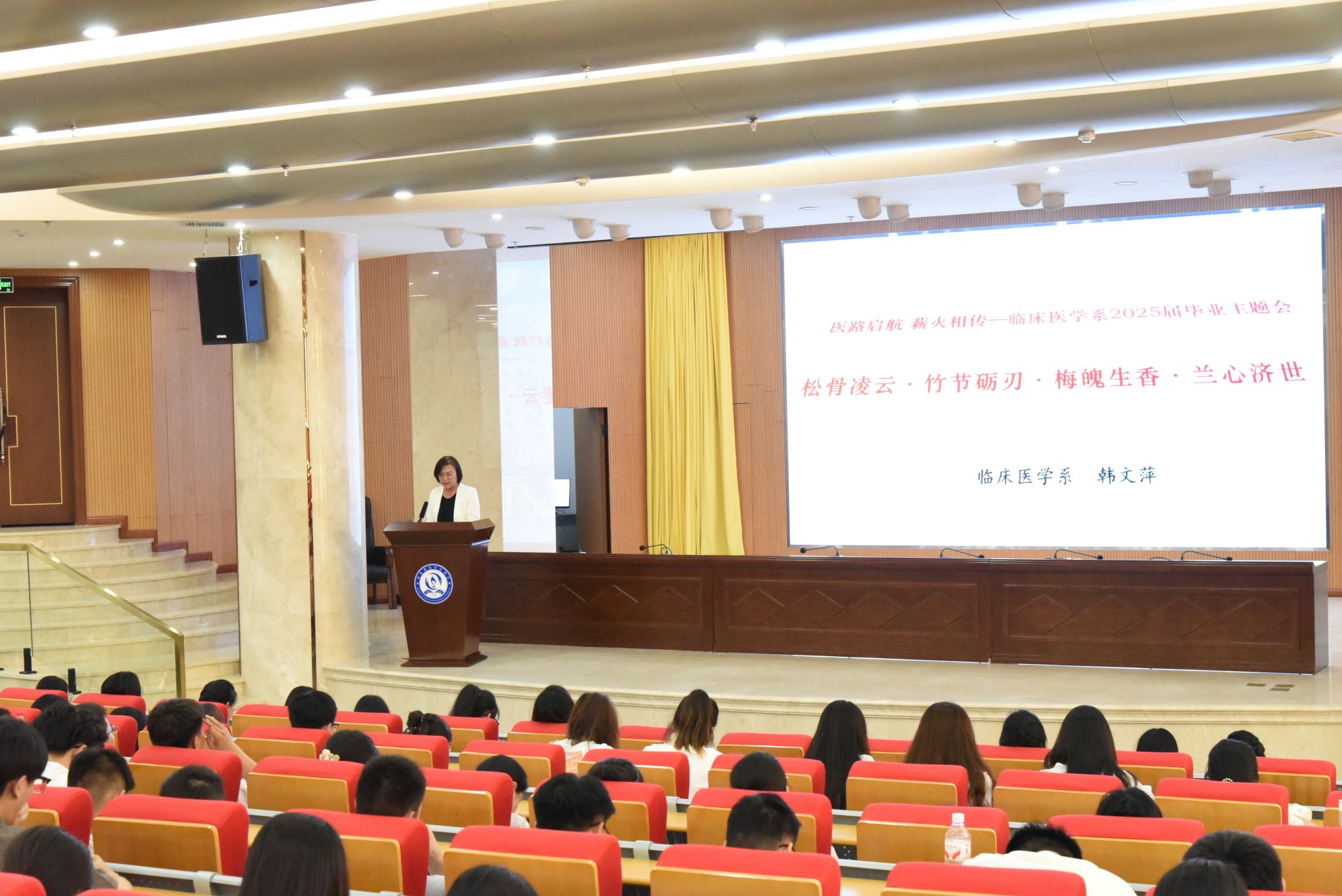 临床医学系主任韩文萍以“松骨凌云、竹节砺刃、梅魄生香、兰心济世”为题,以捐献造血干细胞的朱瑞轩、坚守雷神山抗疫的李宁、自主创业闯天地的王兆兵、志愿服务的奥运会队医连文志等汾院优秀学子为例,勉励毕业生要如松竹梅兰般坚守医者初心、扛起守护生命重任、传递“汾院温度”。