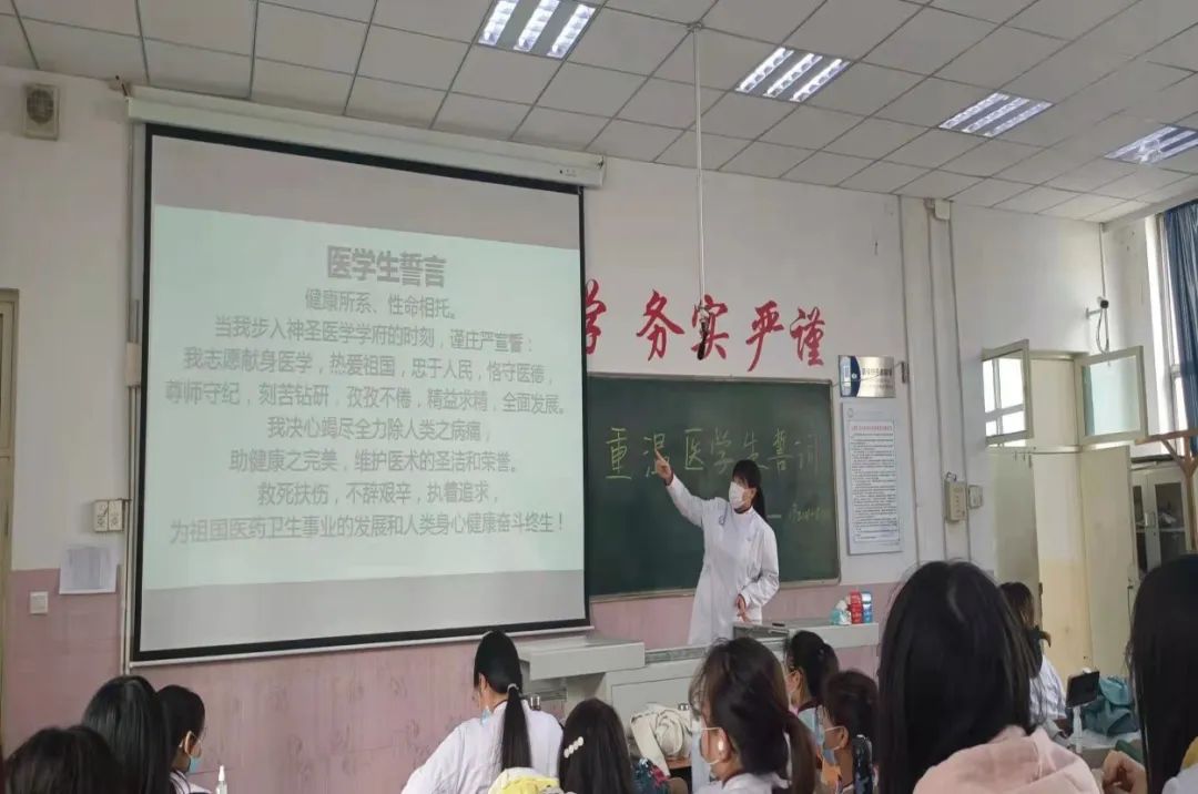 班会开始,全体同学身着白大褂,在班长带领下庄严宣誓:“健康所系,性命相托……为祖国医药卫生事业的发展和人类身心健康奋斗终生”。同学们神情严肃,深刻体会到身为医学生的使命,吴琼同学强调:当今世界疫情形势严峻,身为医学生的我们,更要明白自己身上的责任与担当,要有“虽千万人吾往矣”的奉献精神,在大学生活中也要努力巩固专业知识,提高自身文化修养,坚守自己的初心,为未来祖国的医药事业奉献自己的一份力量。