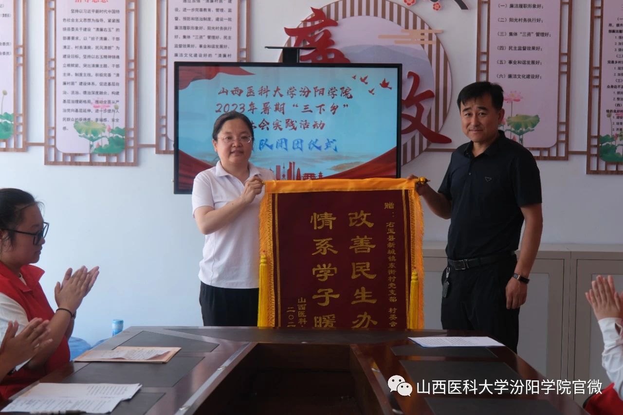 7月17日上午10时,实践队师生们在村委会会议室举办了闭团仪式。新城镇东街村党支部书记王强讲话高度赞扬了实践活动,希望同学们能以此为契机,在实践中感受社会,在锻炼中增长才干。指导教师车昌燕老师和王鑫老师总结发言,队长陈增增、负责人郭佳艳及各组组长分别作总结汇报。村校共叙友谊、互赠锦旗。东街村党支部领导和指导老师共同为同学们颁发了荣誉证书。
